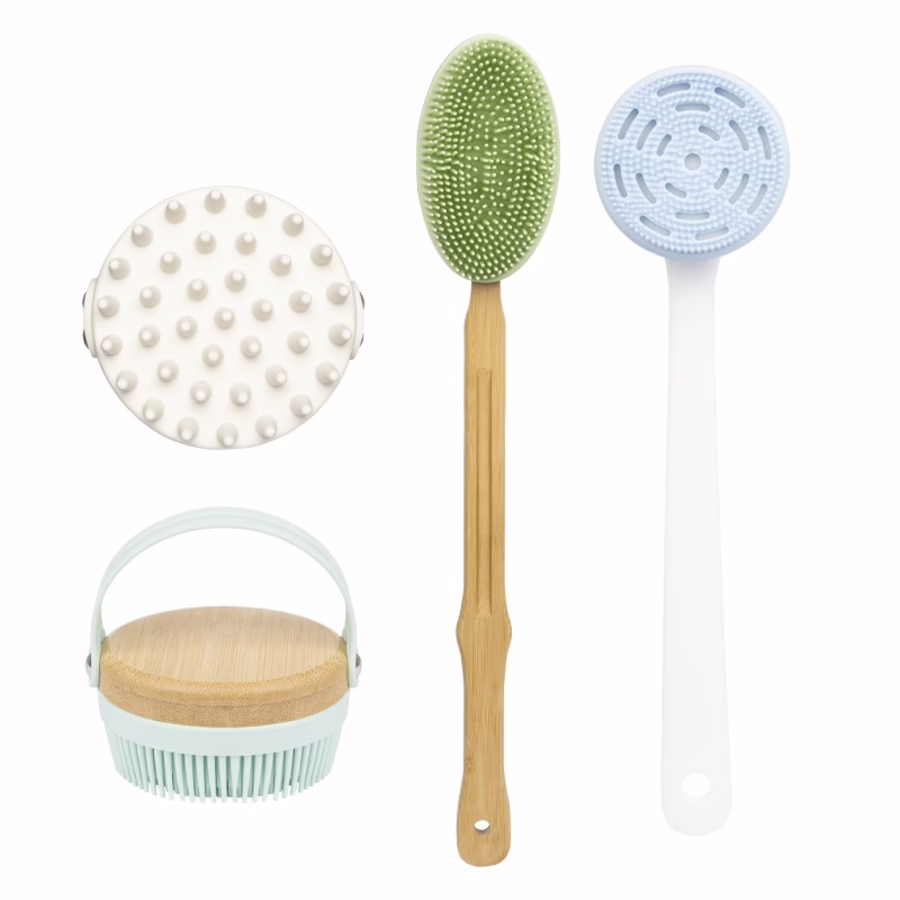 Es besteht aus vier umweltfreundlichen Badebürsten, die Schweiß und Schmutz schonend entfernen und Ihre Haut mit einer sanften Massage verwöhnen: