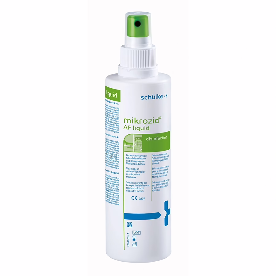 Zuverlässig und effizient – das schülke mikrozid® AF liquid in der praktischen 250 ml Sprühflasche eignet sich optimal für eine schnelle und gründliche Flächendesinfektion. Sie zeichnet sich durch die hohe Materialverträglichkeit von Kunststoffen und Metallen aus, trocknet schnell und hinterlässt keine Flecken. Die alkoholische, gebrauchsfertige Lösung ist VAH und IHO gelistet und somit nachweislich sicher und zuverlässig. Die kurze Einwirkzeit und unkomplizierte Anwendung lassen das schülke mikrozid® AF liquid zu Ihrem treuen Begleiter werden – egal ob zur Reinigung medizinischer und kosmetischer Geräte, Liegen, Handstücke und mehr. Das Produkt ist bakterizid, begrenzt viruzid, fungizid, levurozid und wirksam gegen das Noro-Virus. Egal ob im Studio, Praxis oder Ihrem Zuhause: Bieten Sie den höchsten hygienischen Standard und arbeiten sie völlig rein und keimfrei!