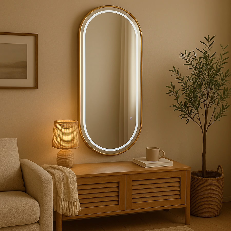Die LED-Beleuchtung lässt sich stufenlos dimmen – von angenehm Warmweiß bis zu klarem Kaltweiß – und passt sich so jeder Lichtsituation ideal an. Die integrierte Technik fügt sich nahtlos in das stilvolle ovale Design mit goldfarbenem Metallrahmen ein. Die Touch-Steuerung ist intuitiv, kommt ohne zusätzliche Geräte wie eine Fernbedienung aus und ermöglicht eine komfortable Bedienung direkt am Spiegel.