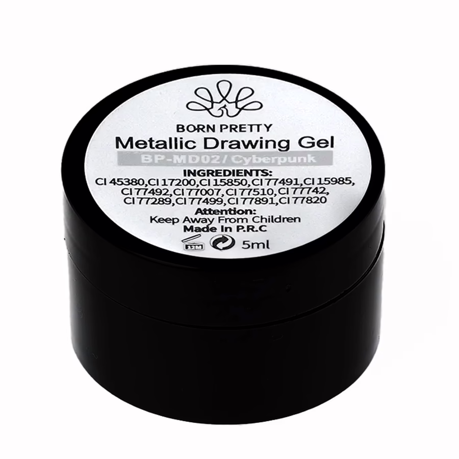 Entdecken Sie jetzt das Metallic Drawing Gel Cyberpunk von Born Pretty. Es verleiht Ihren Nägeln ein mattglänzendes, silberfarbenes Finish und eignet sich als Basisfarbe genauso wie zum Zeichnen feinster Verzierungen.