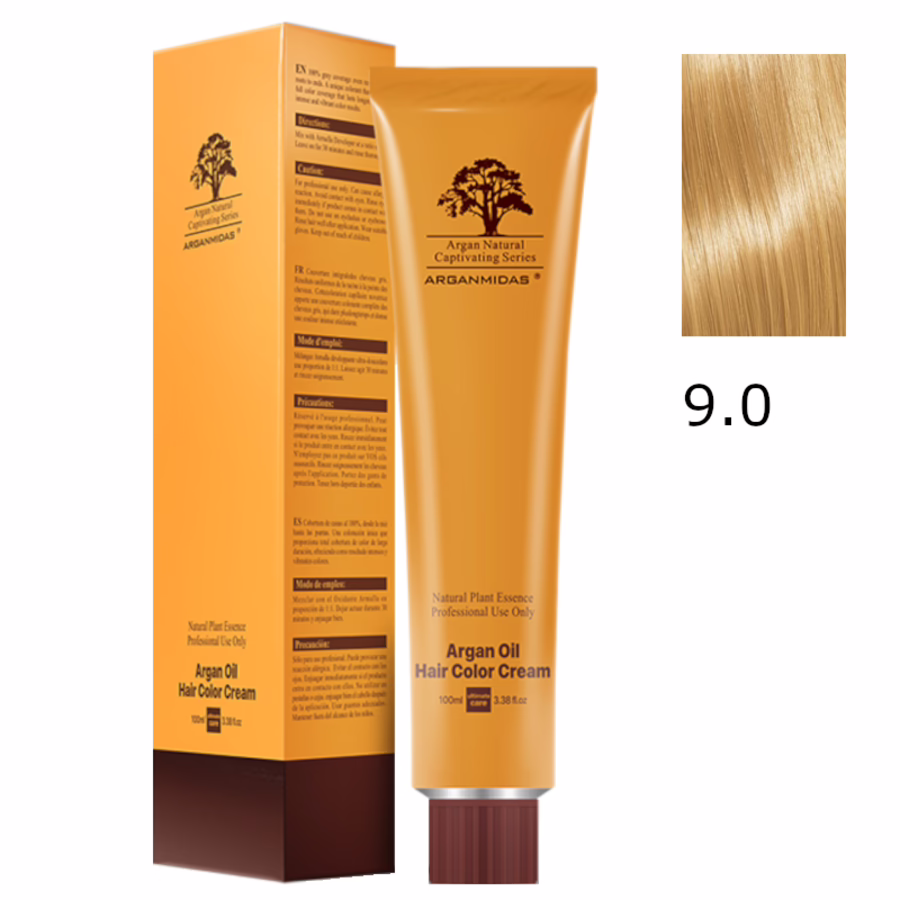 Seidenweiches, glänzendes Haar in strahlendem Hellblond ist der Traum Ihrer Kunden? Dann werden sie die Arganmidas Moroccan Argan Oil Hair Color Cream Natural Series 9.0 Very Light Blonde Coloration lieben!