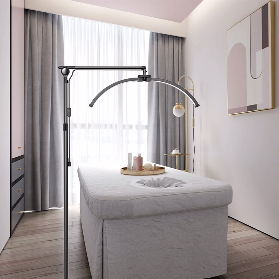Der Bogen ist 70 cm breit und beleuchtet mühelos Ihre gesamte Arbeitsfläche – ganz gleich, ob Arbeitstisch, Behandlungsliege, Wellness-Sessel oder Tattoo-Stuhl. Durch die spezielle Halbmond-Form können Sie, ohne dass Schatten auf die Haut des Kunden geworfen werden, arbeiten. Das Gestell ist bequem und individuell einstellbar, sodass Sie Neigung und Winkel nach Bedarf anpassen und alles stets optimal im Blick behalten können!