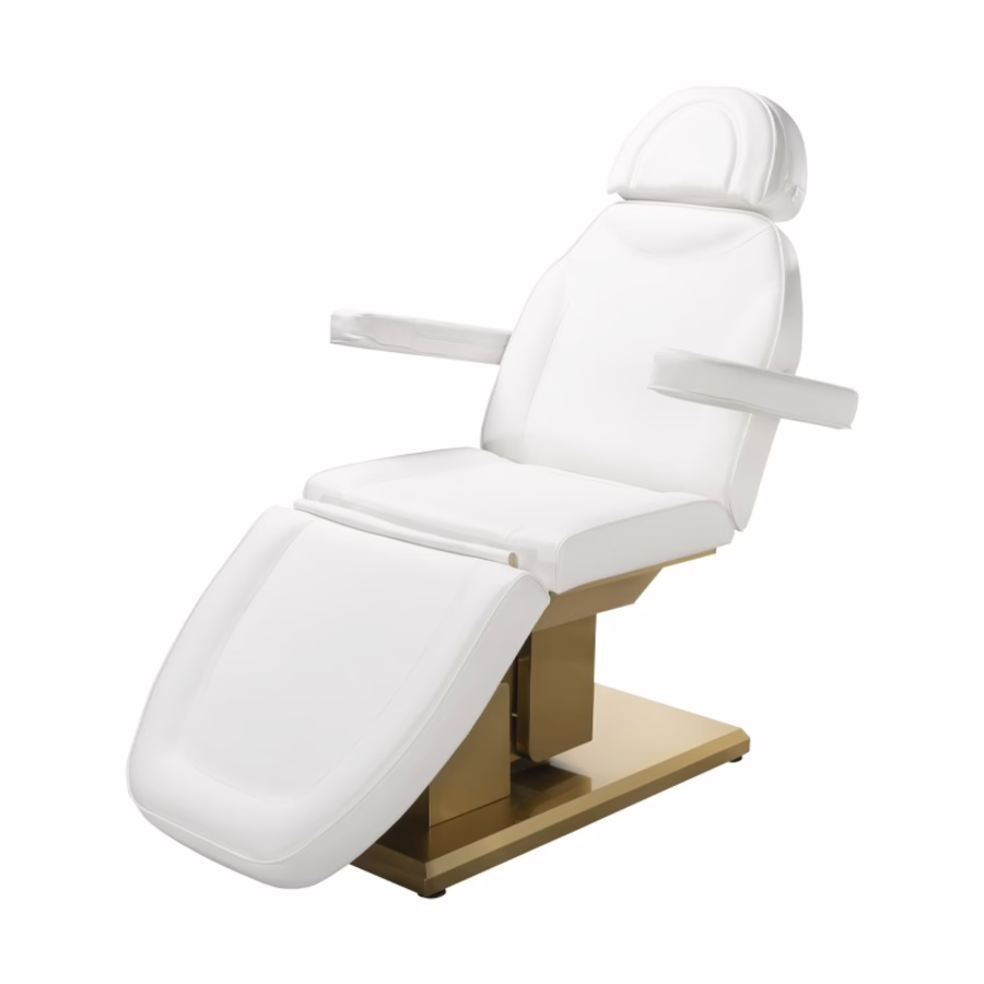 In weiß-goldener Pracht: Die hochwertige, elektrische Kosmetikliege Modell 14 bietet Stil und maximalen Komfort für Ihre Behandlungen!