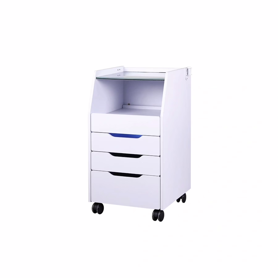 Zusätzlich verfügt der Kosmetik- und Desinfektionswagen über eine Ablagefläche aus gehärtetem Glas. Die verstärkte Glasplatte ist nicht nur ein eleganter Blickfang, sondern überzeugt auch durch hohe Druckbeständigkeit, Sicherheit und eine besonders leichte Reinigung.