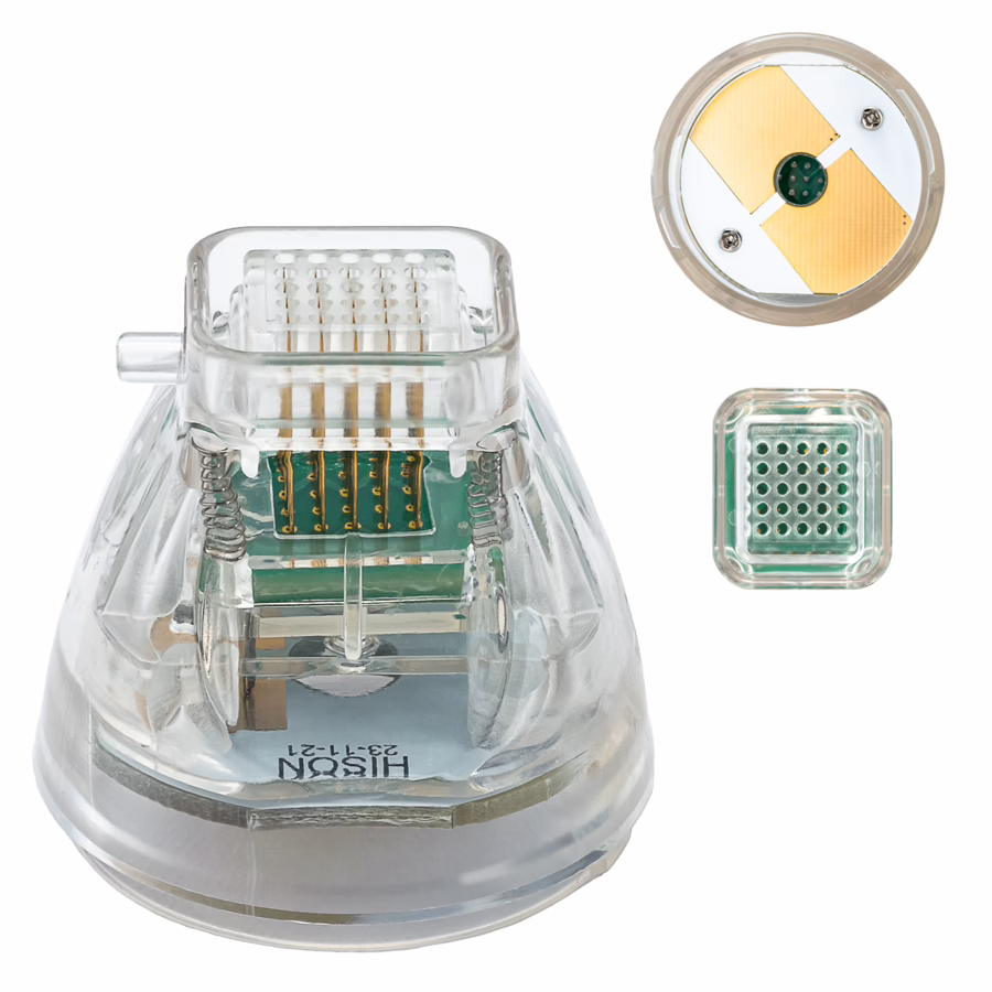 Jede einzelne Nadel ist mit hochwertigen Gold ummantelt, das verhindert, dass die RF-Energie in das umliegende Gewebe abgegeben wird. Nur an den Nadelspitzen, die keine Goldbeschichtung haben, wird die Energie in die Haut geleitet, wodurch die Behandlung deutlich schonender abläuft.