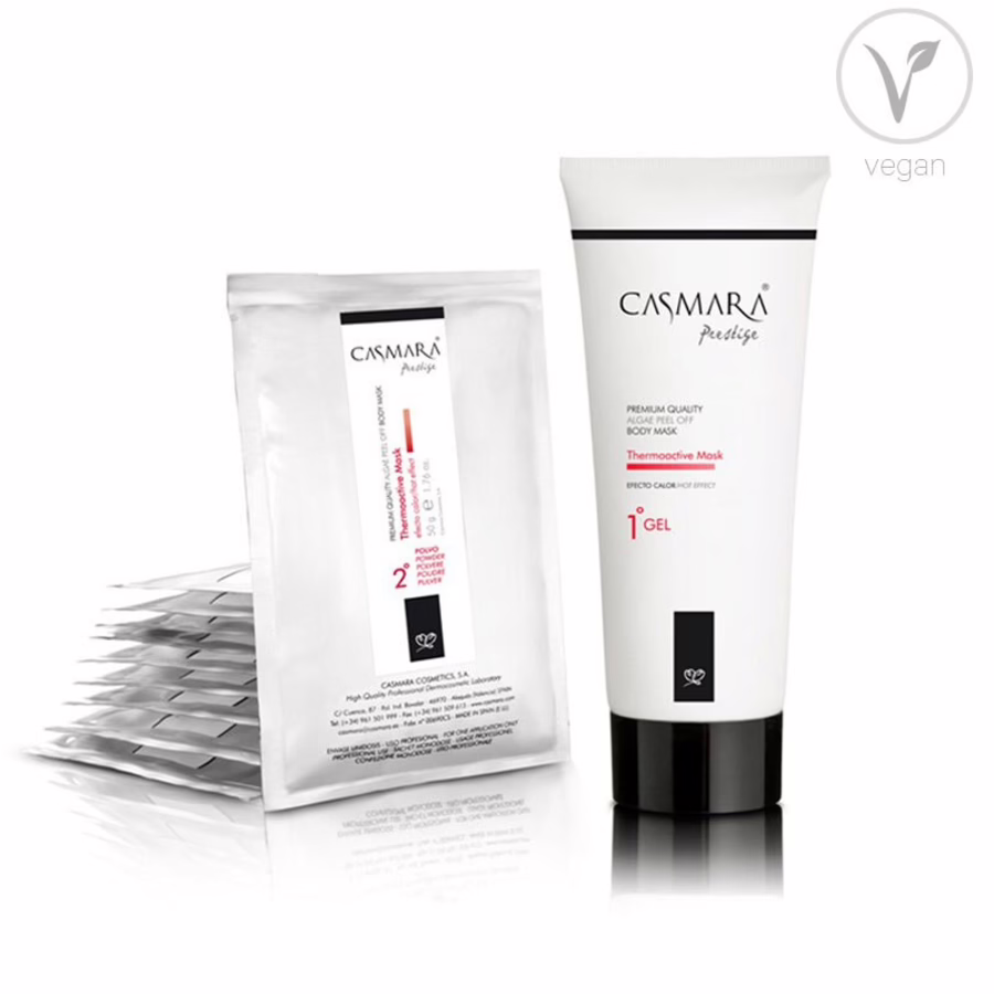 Die einzigartige Formel gegen Cellulite! Die Casmara Thermoactive Körpermaske wirkt effektiv gegen Dellen an Oberschenkeln, Po und Armen. Außerdem kann sie auch im Taillen- und Bauchbereich zur Reduktion von Fettablagerungen angewendet werden. Das Produkt fördert die Durchblutung und Entwässerung – der Stoffwechsel wird angekurbelt. Zwei wesentliche Bestandteile verleihen der Körpermaske eine besonders effektive Wirkung: Seegras ist reich an Omega 3- und 6-Fettsäuren, Mineralien sowie den Vitaminen A und E. Es wirkt intensiv feuchtigkeitsspendend, antioxidativ und schützt die Haut vor schädlichen Umwelteinflüssen und freien Radikalen. Außerdem hat Seegras eine straffende und glättende Wirkung. Das Resin Capsicum (Paprika) setzt den entscheidenden thermischen Effekt zur Reduktion der Cellulite und des Fettgewebes frei. Die entstehende Wärme der veganen Körpermaske regt den Stoffwechsel an und stimuliert das Lymphsystem. Toxine und Fettablagerungen werden abgebaut. Das Ergebnis: Eine sichtbar schlankere und straffere Figur! Das Produkt reicht für 4 Anwendungen und ist für alle Hauttypen geeignet.
