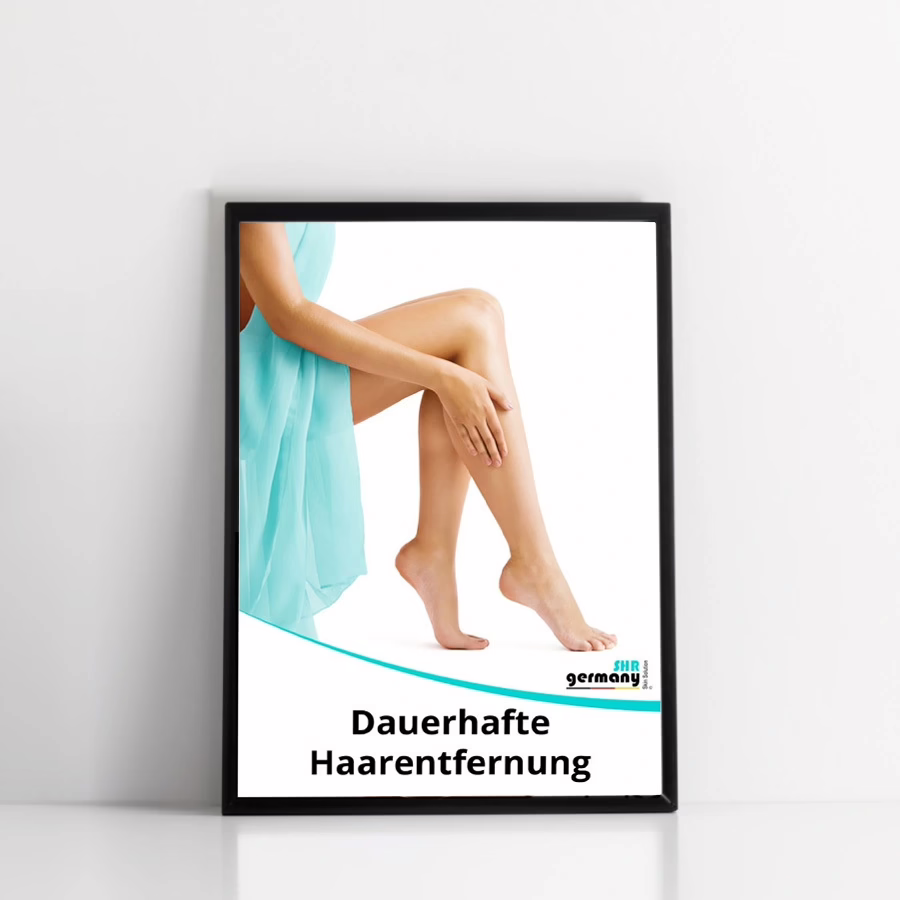 Das hochwertige Poster in glänzendem Qualitätsdruck auf 250g schwerem Papier ist langlebig und mit Maßen von 60 x 80 cm leicht anzubringen. Einen Kundenstopper/ Werbeständer und alles, was Sie für erfolgreiche Behandlungen zur dauerhaften Haarentfernung benötigen, finden Sie ebenfalls in unserem SHR Germany Onlineshop – dem Marktführer in der apparativen Kosmetik!