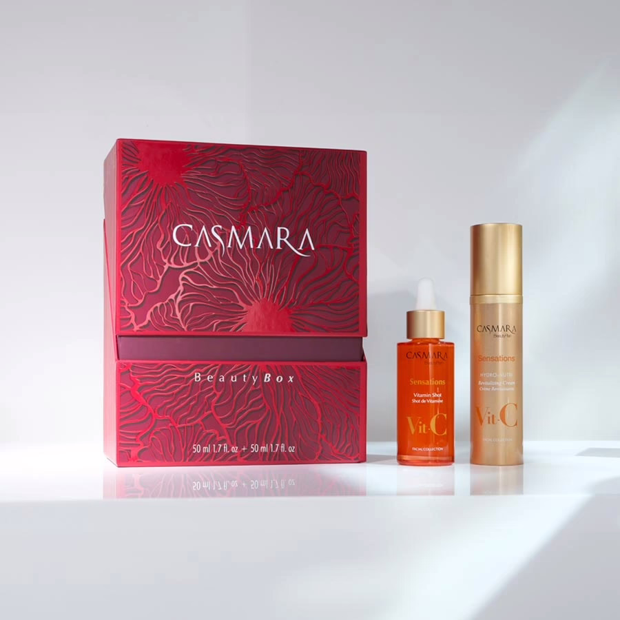 Beide Produkte werden in einer hochwertigen Geschenkbox versandt. Verziert mit zarten, roten Blüten verspricht die Kartonage einen luxuriösen Inhalt – ein Versprechen, das mit den zwei Casmara-Produkten zu 100 % gehalten wird.