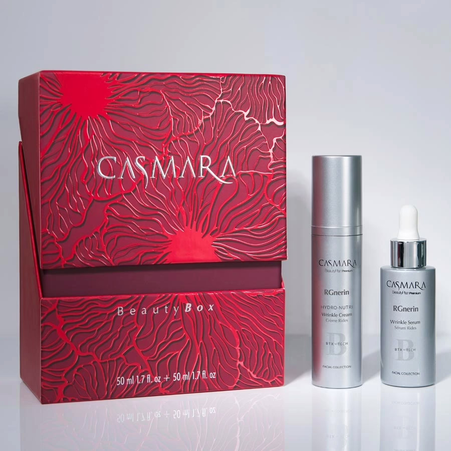 In Kombination erfüllen beide Produkte allerhöchste Anti-Falten-Ansprüche und sind die erste Wahl für reife Haut. Ihre Exklusivität macht sich bereits durch den hochwertigen Umkarton erkennbar, in dem Serum und Creme geliefert werden: Die stabile Kartonage kommt in wunderschönem zarten, roten Blütendesign und spricht für die hohe Qualität dieser Beauty-Box.