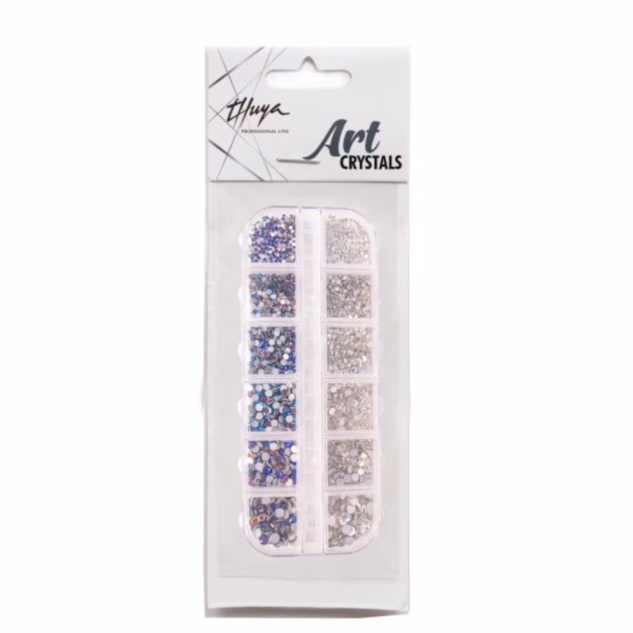 Die Mischung aus Nailart-Strasssteinen der berühmten spanischen Profi-Marke Thuya bietet zwei verschiedene Farben und sechs verschiedene Größen für jeden Typ. Der Brillantschliff, der an die klassische Form eines Diamanten erinnert, bringt den schillernden Glanz der Kristalle voll zur Geltung und sorgt für Lichtreflexe und Farben, die selbst den klassischsten Nagellack-Ton zu einem echten Blickfang machen.