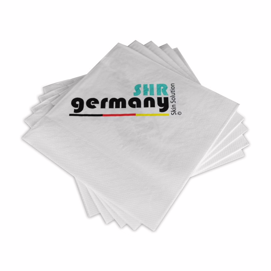 Die schneeweißen Servietten sind mit dem bekannten SHR Germany-Logo bedruckt, um Ihren Kunden zu zeigen, dass Sie auf die hervorragende Qualität des deutschen Marktführers im Bereich der apparativen Kosmetik und dauerhaften Haarentfernung setzen.