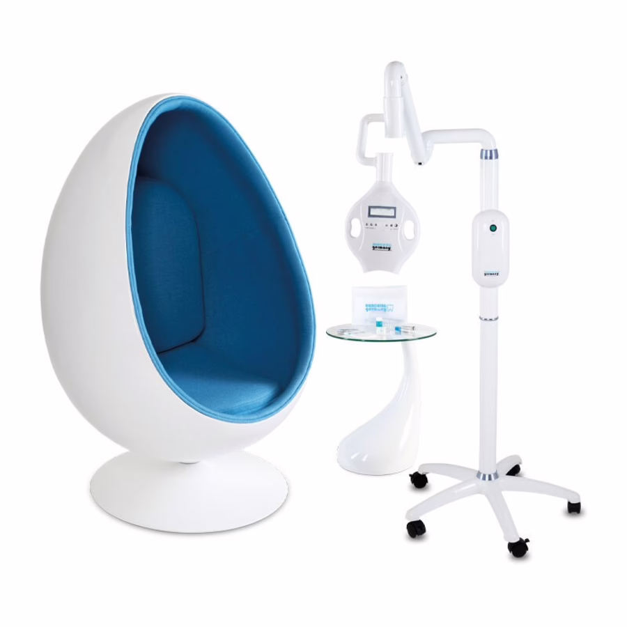 1x LED Bleaching Lampe, 1x Eisstuhl, 1x Beistelltisch, 3xBehandlungssets, 1x Kunden-LED-Schutzbrille, 1x Werbeposter, 1x Schulung |